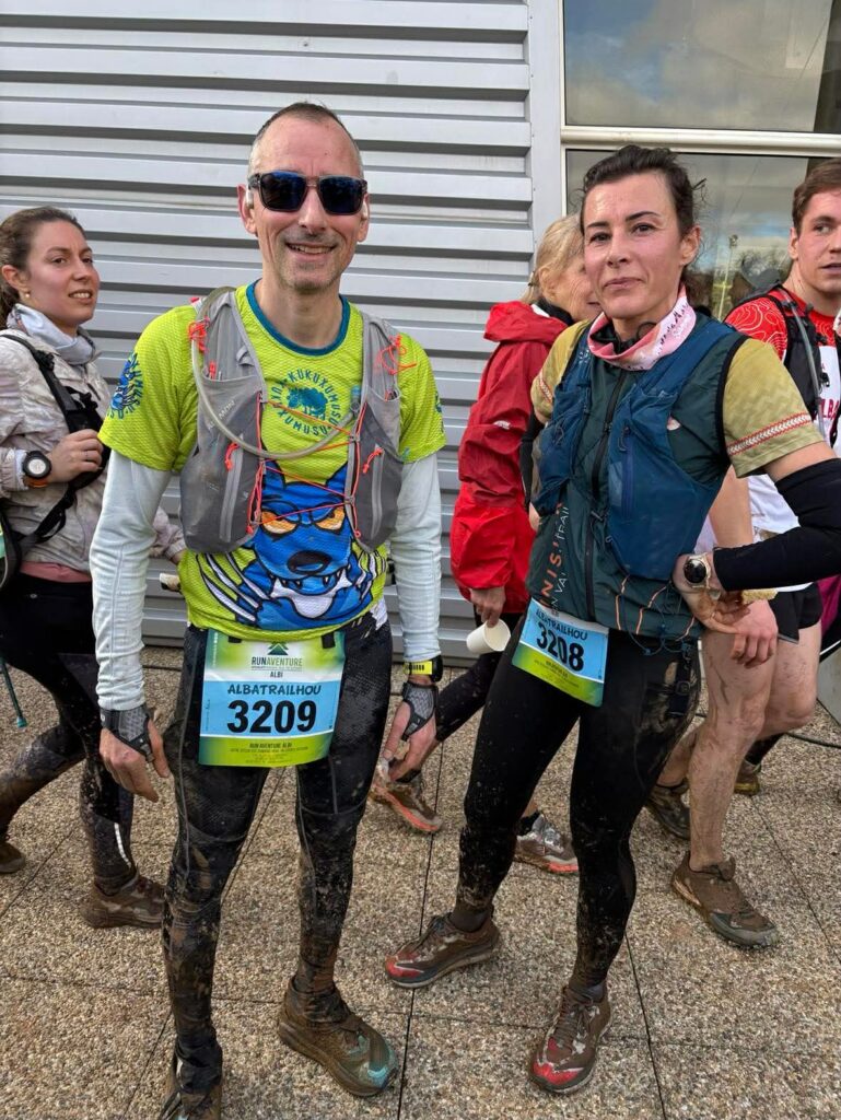 Philippe Merlin, Marie Julien, Romain Vigné termine vaillamment ce trail très boueux et glissant ensembles, heureux et souriant, tout l’esprit de la Team !